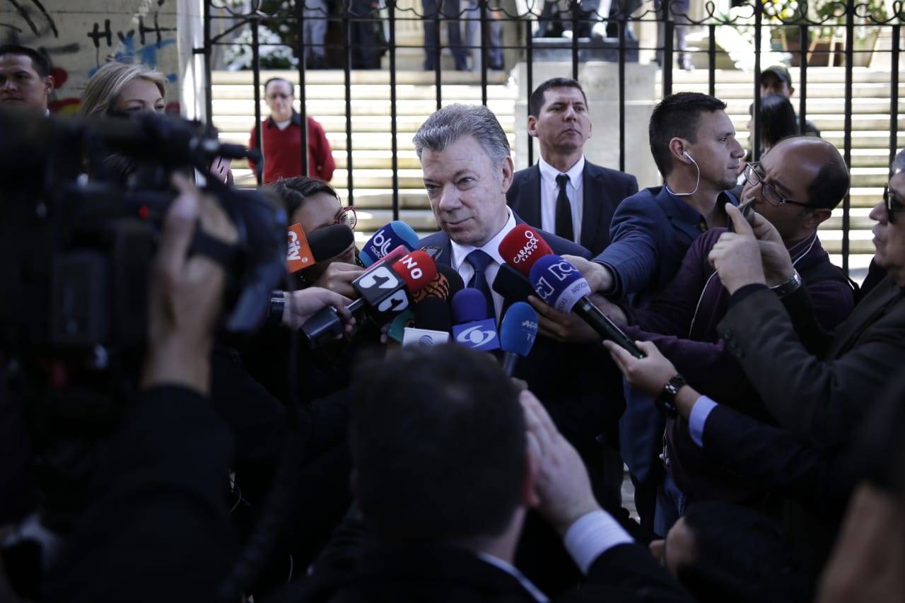 Hacia el mediodía, el expresidente Juan Manuel Santos llegó a las instalaciones de la Academia Colombiana de la Lengua para dar pésame a los familiares del expresidente Betancur. Lo hizo en compañía de su esposa María Clemencia Rodríguez y aprovechó para recordar al exmandatario de quien recuerda la fuerza y el impulso que le dio para no desfallecer en la búsqueda de la paz.