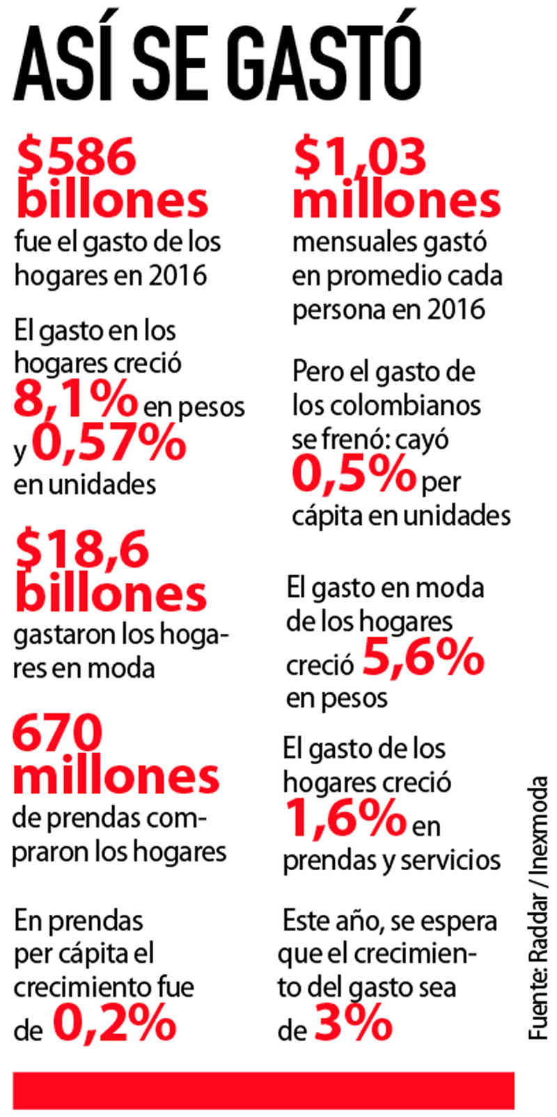 En los últimos años el mercado colombiano ha tenido un crecimiento sostenido en materia de gasto en moda. Aunque las cifras de 2016 estuvieron afectadas por la inflación más alta de los últimos 16 años y la incertidumbre política, el año pasado los colombianos gastaron $18,6 billones en moda, lo que significa un crecimiento de 5,6% frente al año 2015, de acuerdo con cifras de Raddar e Inexmoda.