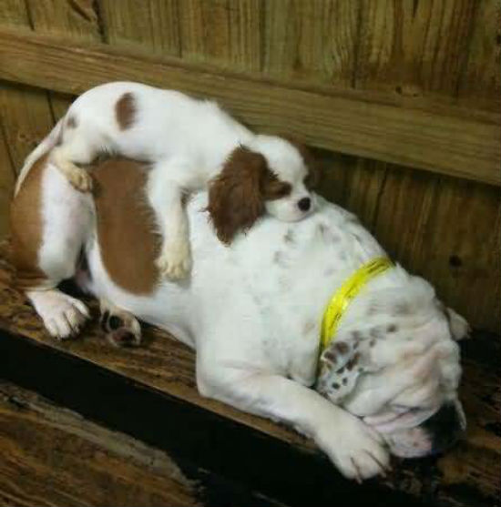 Esta es una relación gana–gana. El cachorro tiene un excelente colchón y, a su vez, le sirve de manta a su nuevo mejor amigo.