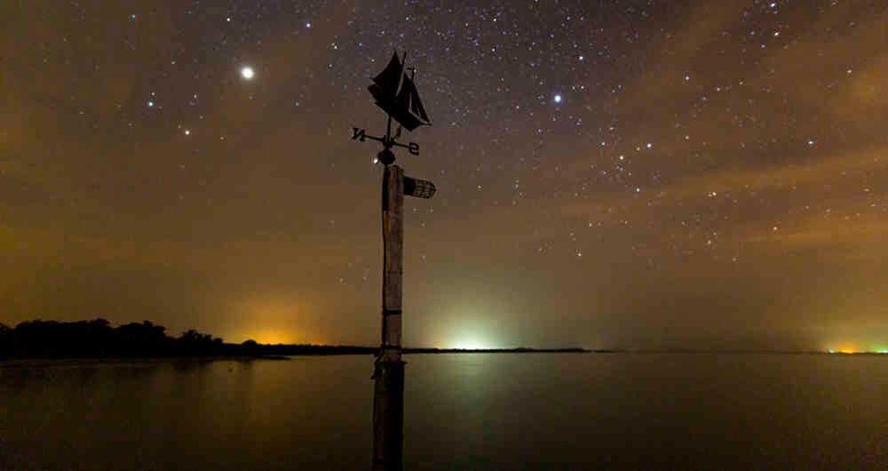 Golfo de Morrosquillo, Sucre. Esta veleta marca la dirección del viento. Al fondo brillan las luces de Tolú y Coveñas.