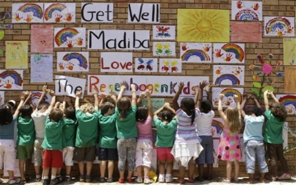 Un grupo de niños en Sudáfrica levantan sus brazos en apoyo a Mandela durante su enfermedad. Manifestaciones como esta se repitieron por todo el país.