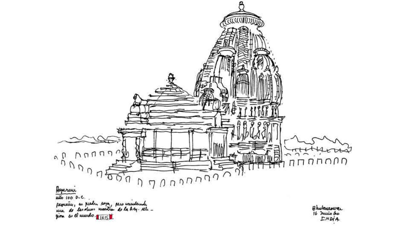 Germán me escribió una carta contándome de su viaje y me preguntaba si lo podía recibir. Yo le dije “claro, ven y aquí ya veremos cómo nos acomodamos”. Estuvo aquí algo más de una semana. En esa época vivía en una casa muy pequeña, con mi suegra, mi hija menor y mi esposa. Era una casa austera, típica de la India, con dos espacios y medio: una habitación principal, la sala y lo que aquí llamamos una veranda, que es como una terraza pequeña al aire libre. Él no tuvo ningún problema en dormir ahí. Era fresco y hacía muy buen clima. Yo también quería que él tuviera una experiencia auténtica. Entonces íbamos y veníamos todo el día. Paseamos, visitamos muchos de los monumentos y edificios antiguos, y él quiso ver también los proyectos en los que yo estaba trabajando en ese momento. Me di cuenta de que a todas partes llevaba su cuaderno de apuntes. Siempre estaba dibujando. Todo lo que vio lo dibujó de manera bellísima porque era un gran artista, no solo un gran arquitecto.