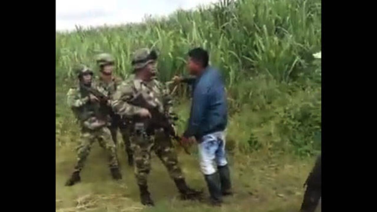 Las imágenes son impactantes. Un video publicado por el ex vicepresidente Germán Vargas Lleras en su cuenta de Twitter este viernes muestra el momento en que militares son agredidos por miembros de una comunidad indígena, en medio de un operativo de desalojo. En uno de los apartes se ve cómo un soldado es amedrentado con un cuchillo en el cuello. Durante varios minutos, las partes se enfrascan en una acalorada discusión en la que uno de los uniformados hace disparos al suelo.