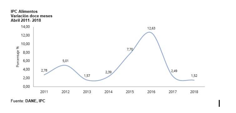 En la actualidad, la inflación anual es la más baja desde 2014 y se ubica dentro del rango meta del Banco de la Republica, entre el 2 y el 4 por ciento con una media de 3 por ciento. Esto ha sido en parte gracias al buen comportamiento del grupo Alimentos que han registrado en los últimos 12 meses la tasa más baja registrada en los últimos ocho años. Por esto, mismo es difícil que sigan bajando y que su contribución hacia futuro sea al alza, con lo cual dificultarán que el emisor siga recortando las tasas de interés.