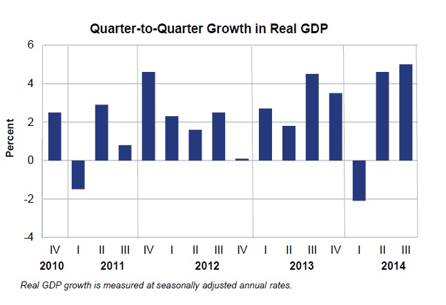 Entre abril y septiembre, la economía estadounidense tuvo su mayor semestre de expansión desde mediados de 2003. Los economistas creen que el crecimiento se desacelerará en el último trimestre del año hasta un ritmo anual en torno al 2,5 % y para 2015 se mantendrá en alrededor del 3%.