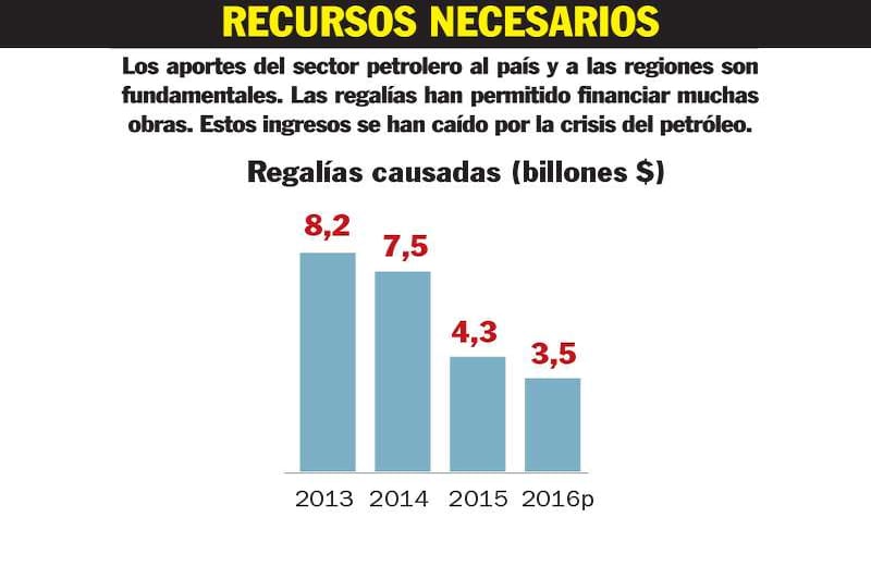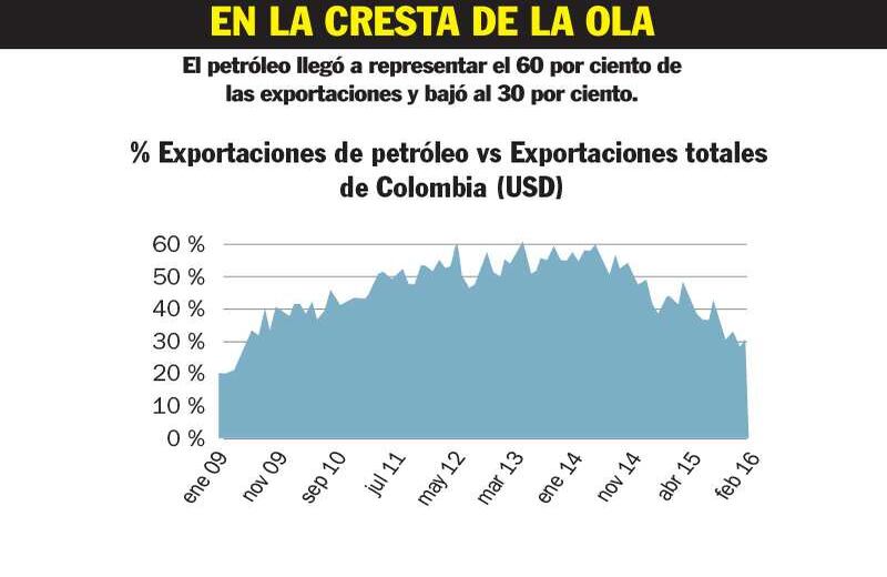 EN LA CRESTA DE LA OLA El petróleo llegó a representar el 60 por ciento de las exportaciones y bajó al 30 por ciento. RECURSOS NECESARIOS Los aportes del sector petrolero al país y a las regiones son fundamentales. Las regalías han permitido financiar muchas obras. Estos ingresos se han caído por la crisis del petróleo. Las obras de una carretera, pensada para facilitar la entrada al sitio de presa, fueron suspendidas por una decisión de la Anla. Temen retrasos en esta importante central hidroeléctrica.