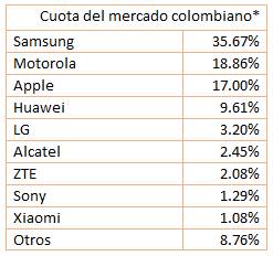De acuerdo con Statcounter, en Colombia la participación de mercado de los teléfonos inteligentes coincide con los datos mundiales, en el primer y en el tercer puesto, siendo Samsung el vendedor más importante, mientras que Apple ocupa el tercer lugar.