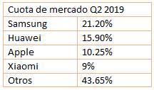 Un estudio de la firma de investigación Gartner calcula que para el final del año se vendan 1.500 millones de unidades solo de smartphones en todo el mundo. Esto, obliga a las demás marcas a innovar de manera constante para mantener fidelizados a sus consumidores. Pues, la cuota de mercado internacional al cierre del segundo trimestre de 2019 finalizó así: