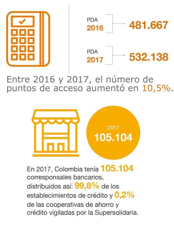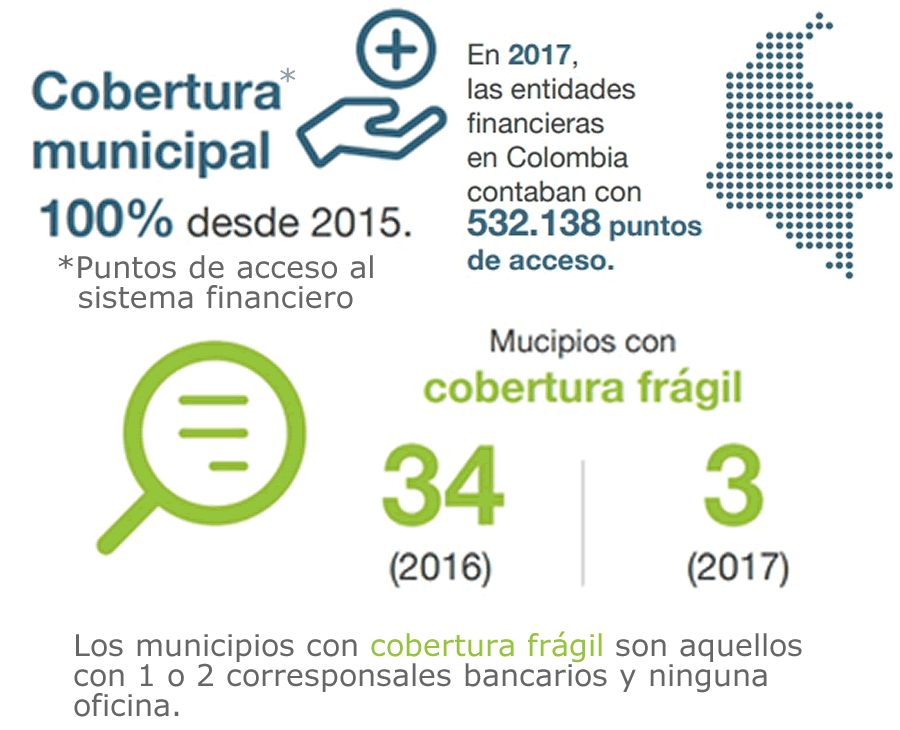 La banca tradicional ha ampliado su cobertura a niveles nunca antes vistos. Según cifras de la Superintendencia Financiera de Colombia y la Banca de las Oportunidades, el 69 por ciento del sector rural cuenta con al menos una oficina bancaria, mientras que la cobertura de los corresponsales cubre el ciento por ciento de los municipios del país.