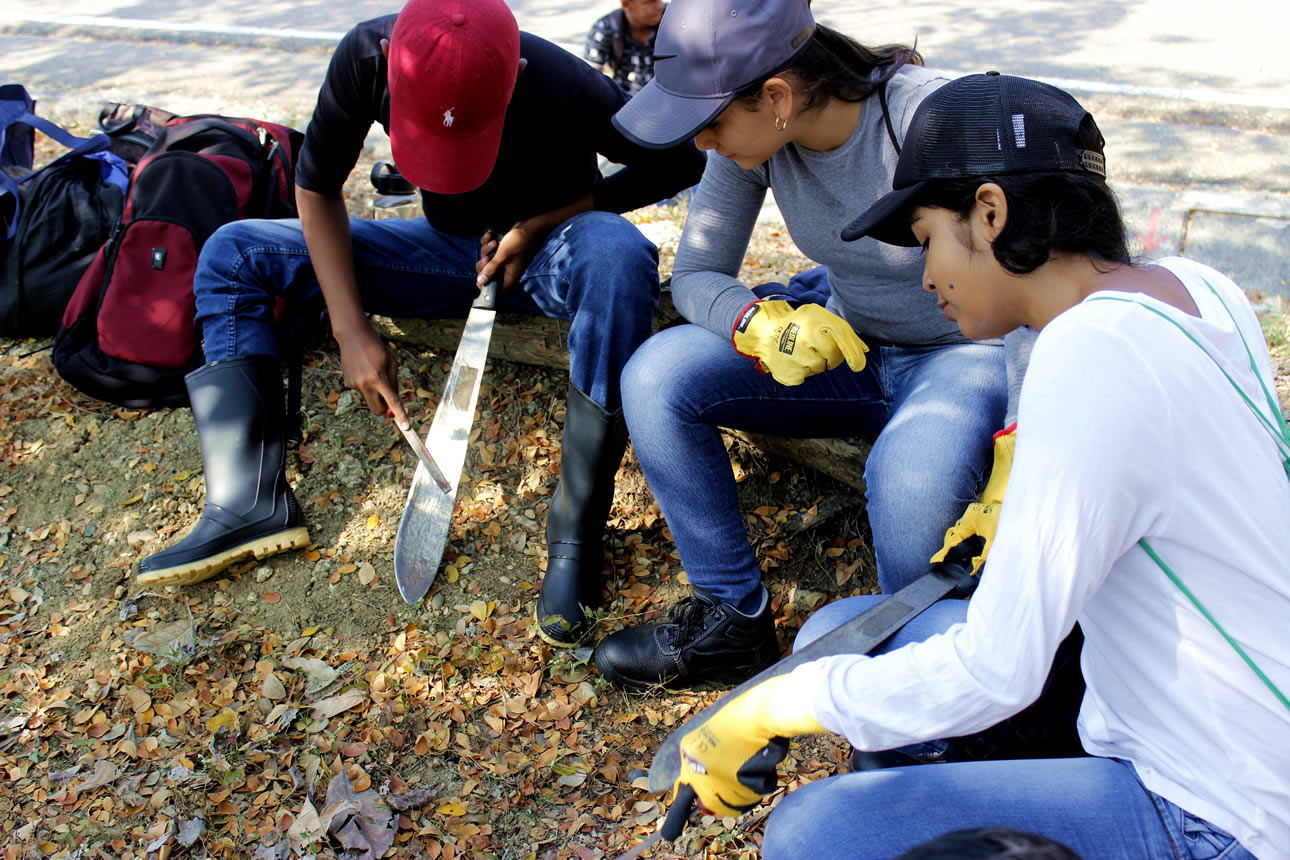 Después de ponerse botas pantaneras, guantes y gorra –“la vestimenta también se califica”, dice el profe en tono de broma- el grupo de universitarios se sienta a afilar los machetes.