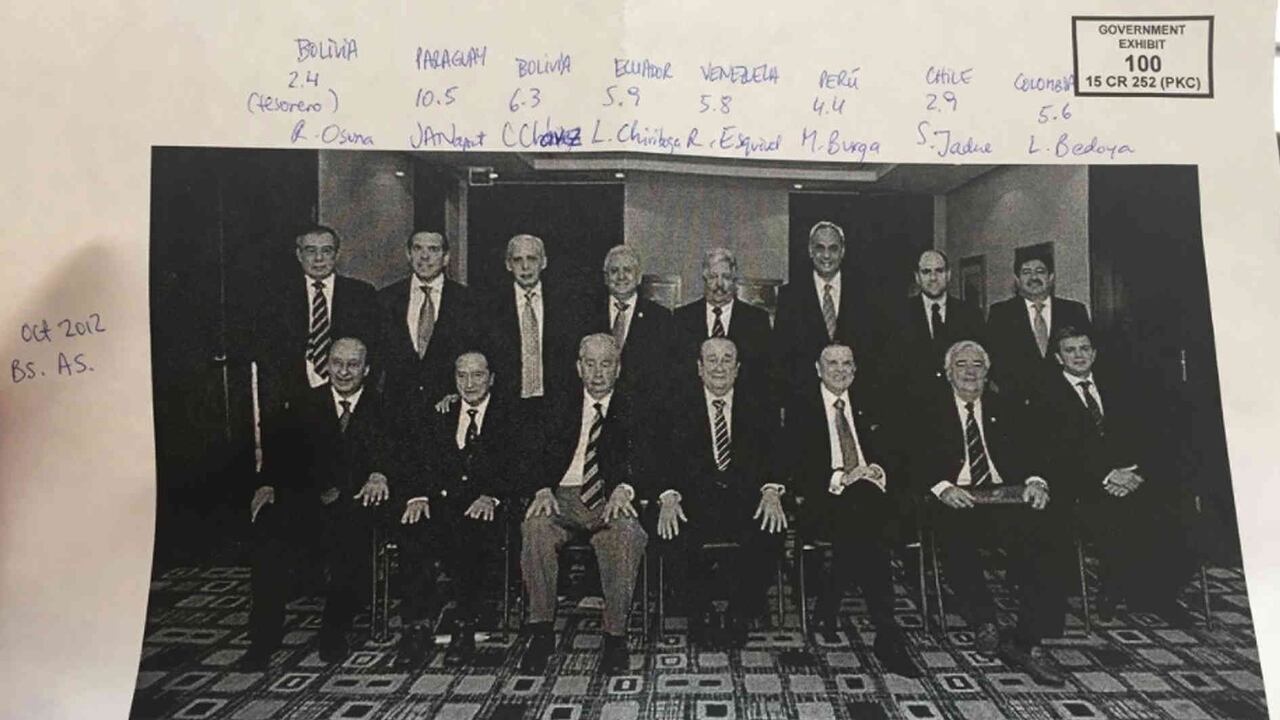 La imagen, marcada como la prueba 100 en el proceso en contra de Juan Angel Napout (Paraguay), José Marín (Brasil) y Manuel Burga (Perú), data del año 2012 cuando los presidentes de las diferentes asociaciones y federaciones sudamericanas se reunieron unos días en Buenos Aires. Los tres exdirigentes están acusados de conspiración para delinquir, y Marín y Napout también de fraude bancario y lavado de dinero.