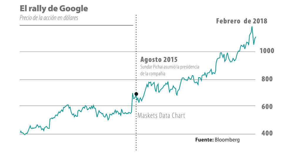 La razón para la exorbitante remuneración de Pichai es simple: aunque su salario es US$625.000 al año, su contrato implica una compensación expresada en acciones de Google y relacionada con los resultados de la compañía. Para la compensación de 2016, Pichai recibió 273.328 acciones. Así que el bienestar económico de este alto ejecutivo está estrechamente relacionado con la situación de Alphabet, la nueva holding que agrupa todos los activos asociados a Google (ver recuadro). Cuando la acción de Alphabet sube (ver gráfico), el patrimonio de Pichai hace lo mismo.