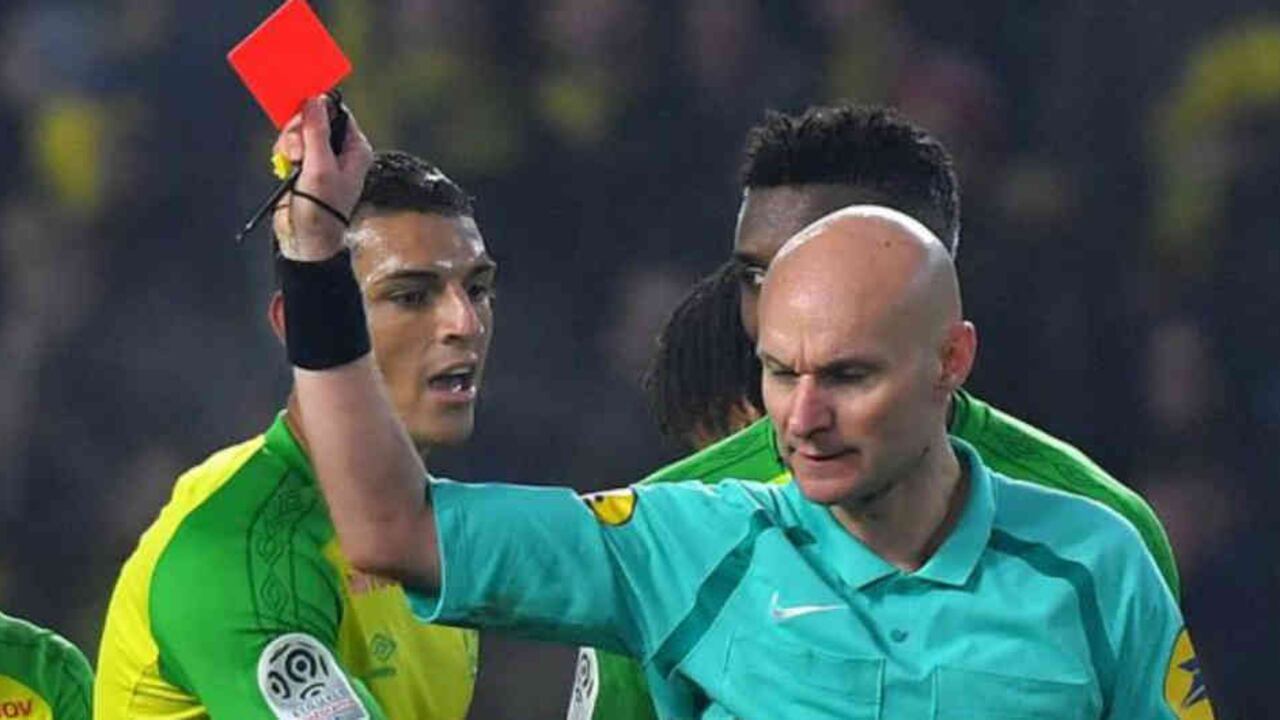 El árbitro Tony Chapron se tropezó con Diego Carlos del Nantes, reaccionó con una patada, cobró falta para el PSG y terminó echando al jugador por doble amarilla.