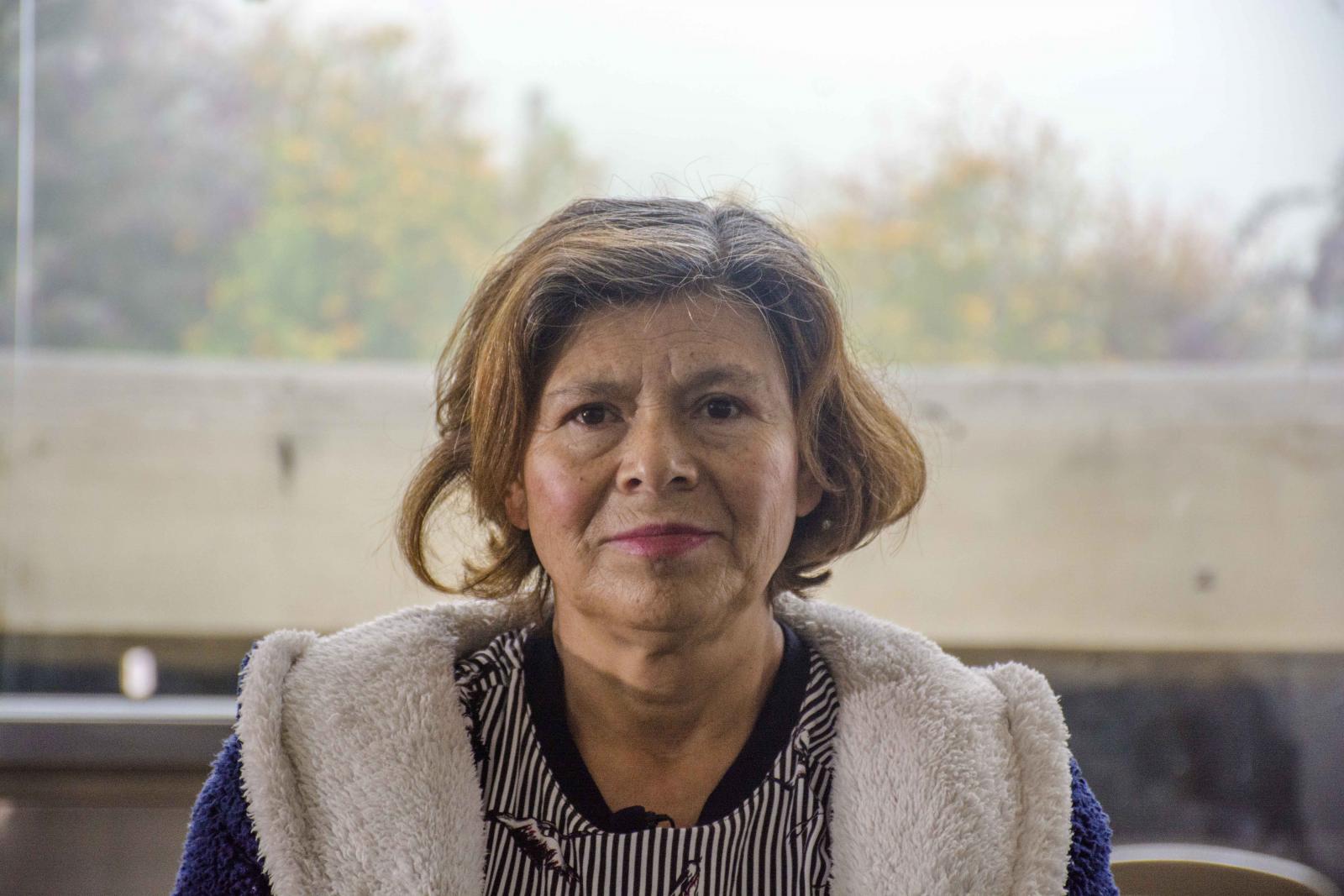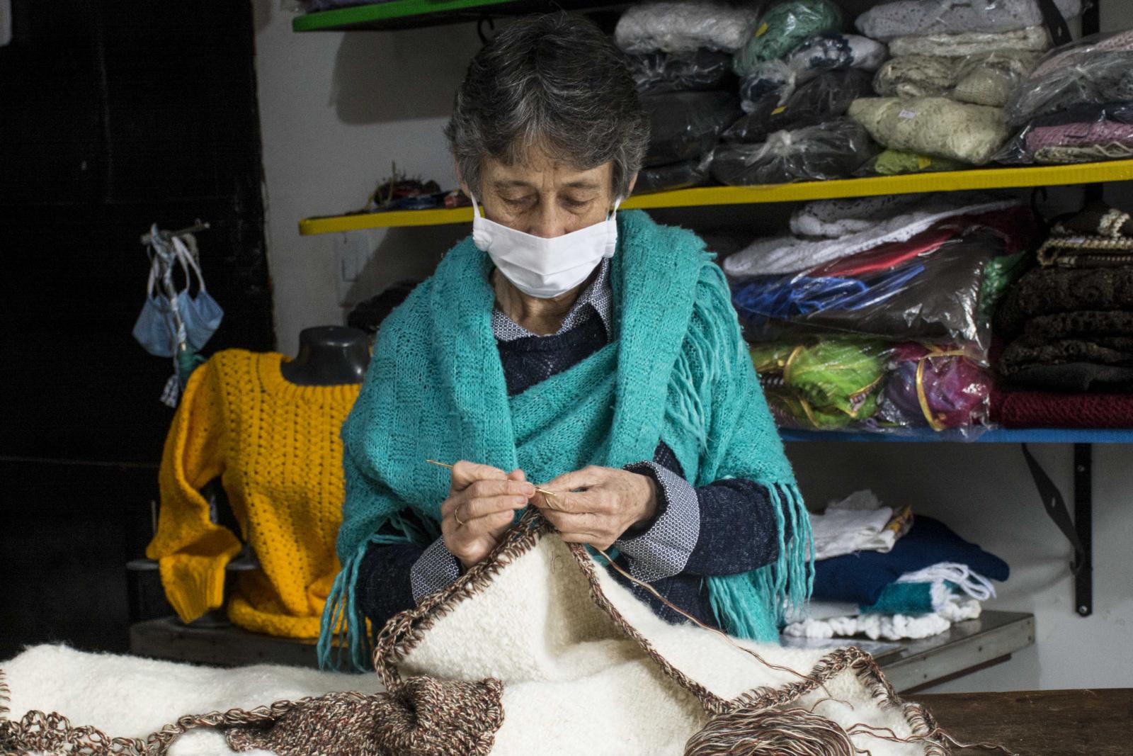 Marina, mientras usa su tapabocas, teje una ruana en el taller de la escuela donde ha enseñado por más de 40 años.