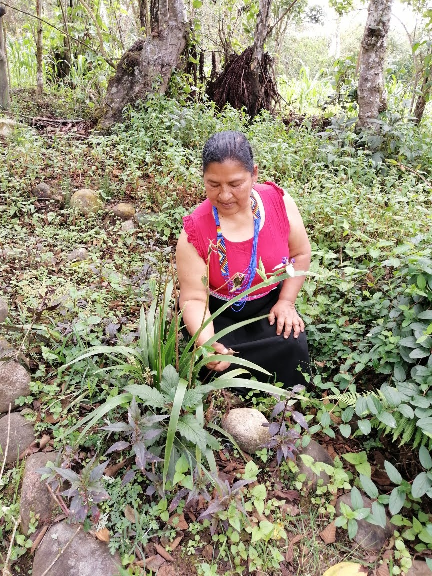 En la foto se ve a Ana María revisando una de las plantas en su chara, que signfica huerta en español y donde cultiva cientos de plantas que han acompañado a su cultura por generaciones. Esta es una de la materias que dicta en la institución.