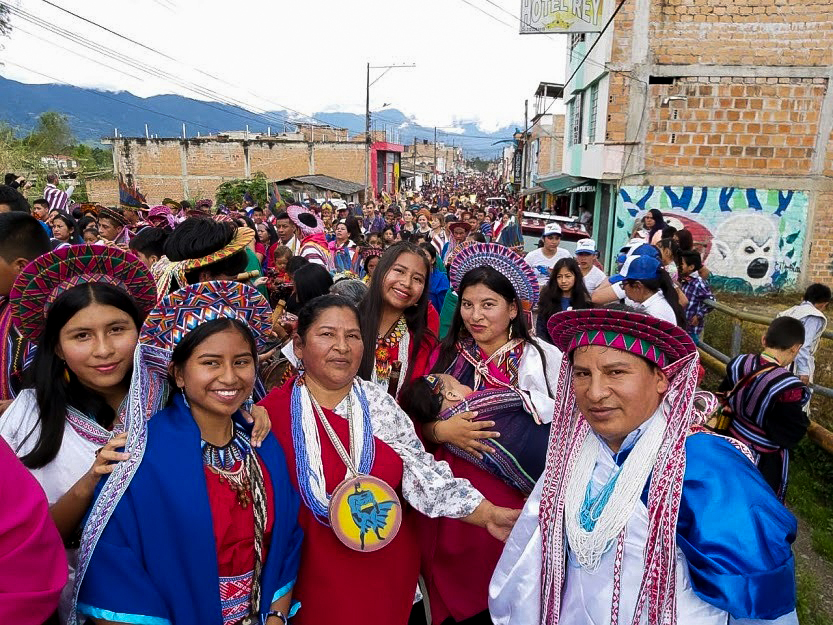 El pueblo Kamëntsa gira en torno a la familia y a la preservación de la cultura. En la pandemia estos valores se exaltaron por el tranbajo de profesoras como Ana María, quien ha sacrificado todo para cuidar a sus alumnos y su identidad. En la foto se ve a Ana María, en el centro con un collar y vetida de rojo, durante el Festival del Perdón “Bëtsknaté”.