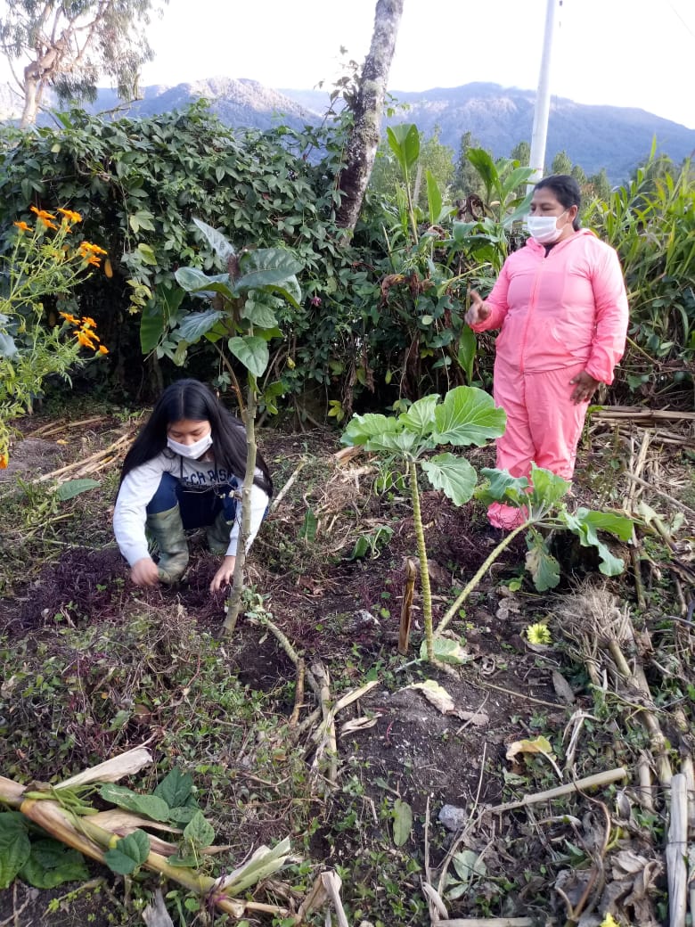 En la foto se puede ver a Ana María (derecha), quien le enseña a una de sus estudiantes el manejo de la chagra durante uno de sus recorridos por las veredas del municipio.