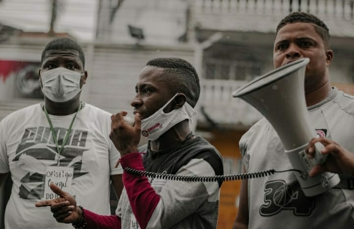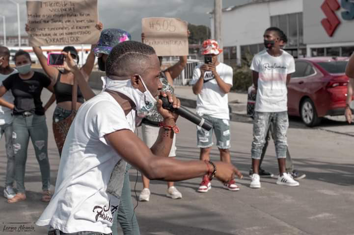 Leonard, a quien se ve sosteniendo un micrófono, ha impulsado los mviemientos sociales en la ciudad a partir de su liderazgo. En la actualidad, con su movimiento Buenaventura Resiste, promueve la cultura, el arte, el deporte y la intevensión psicosocial para ayudar combatir la violencia.