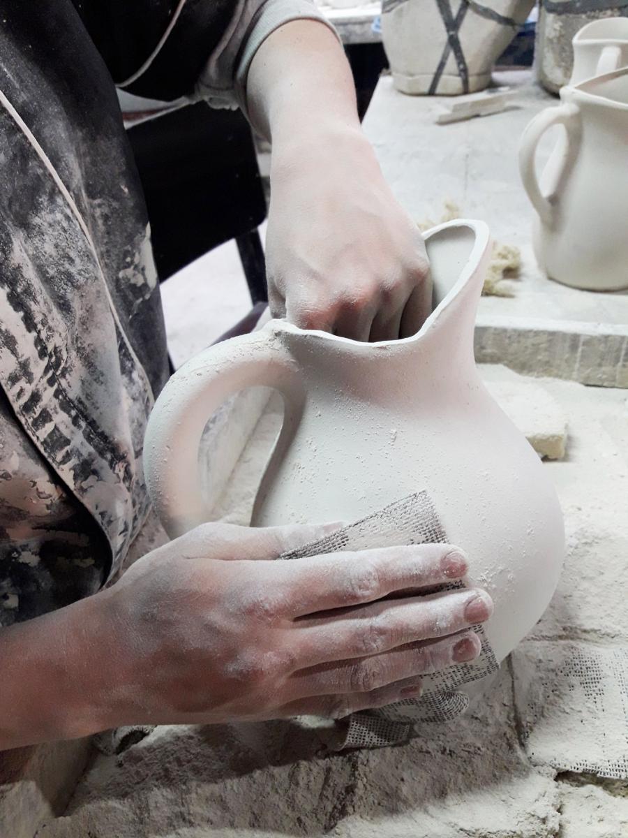 Gladys saluda a Deicy, quien lleva apenas un mes trabajando en el taller pero ya explica todo el proceso como si tuviera varios años de experiencia. Deicy tiene en sus manos una jarra a la que consiente con una lija para que adquiera la forma esperada. Al terminar, me enseña una jarra anterior y las compara para demostrarme que, pese a que el proceso es el mismo, ambos productos son diferentes. Y en efecto lo son: una es más gruesa que la otra, pero ambas están perfectas.
