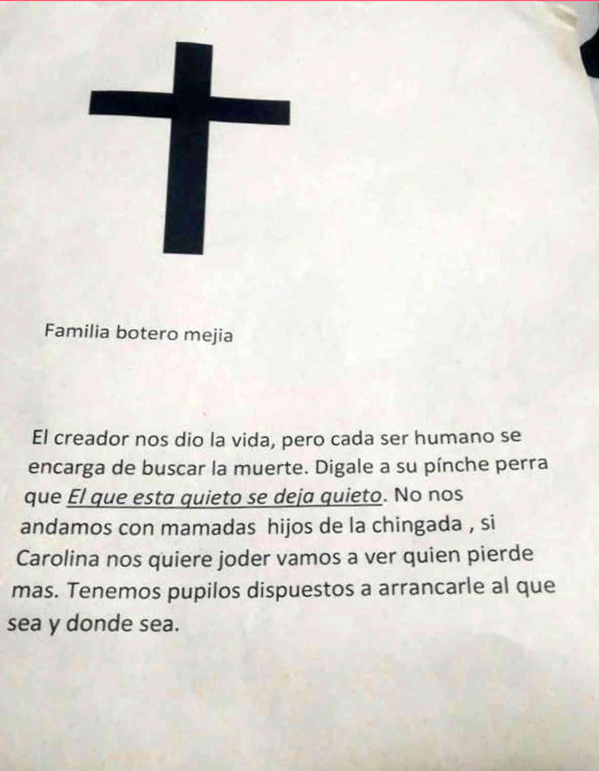 Si bien el Colectivo Ágora Cívica nunca publicó nombres en su denuncia, lo cierto es que cuando estaban preparando la denuncia pública comenzaron a llegar amenazas. Todas son anónimas y se resalta una frase que dice: “El que está quieto se deja quieto”. A continuación, se muestra el panfleto.