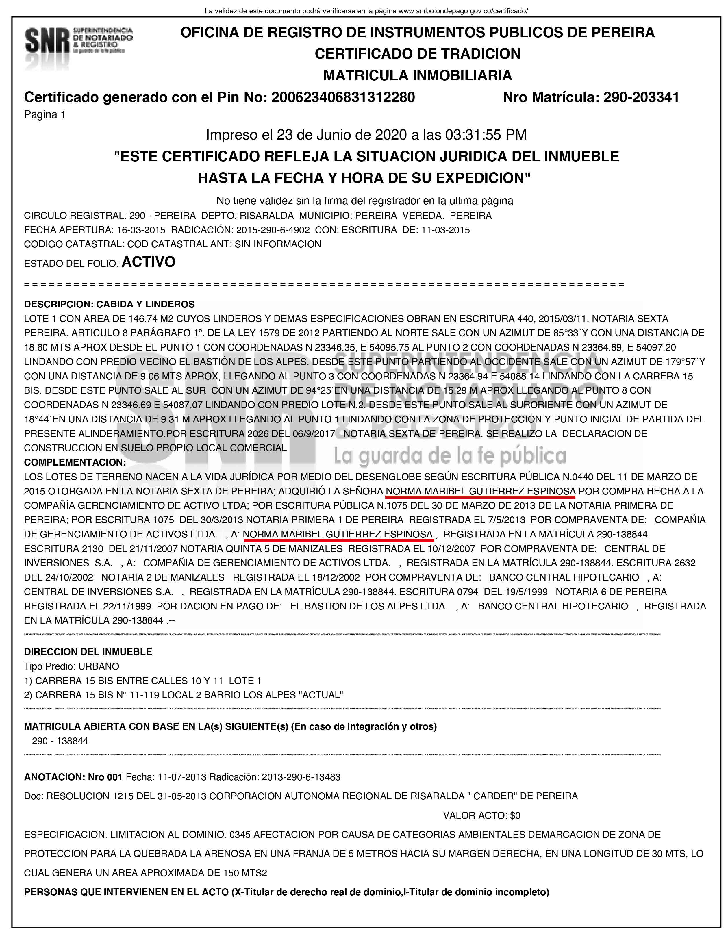 En el certificado de tradición de los tres lotes, se lee que, fue adquirido por Norma Maribel Gutiérrez Espinosa quien se desempeñaba como asistente del exdiputado Marín cuando ejercía el cargo de diputado. A continuación, se puede ver la foto.Ella, también, hacia parte del comité ejecutivo del Partido Liberal para 2015 de Pereira, donde también estaban el señor Marín y el actual alcalde. Se debe recordar, igualmente, que Mónica Botero, quien es secretaria privada del actual alcalde y Alexander Galindo quien es director de Gestión del Riesgo de Pereira fueron imputados por la fiscalía por presuntas irregularidades en medio de la contratación de la covid-19.