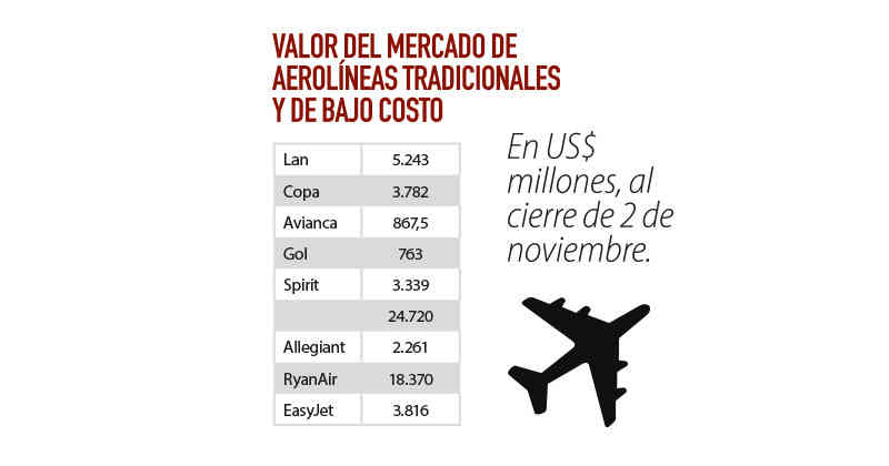 Mientras hoy una compañía como Latam tiene una valorización de US$5.242 millones –al cierre de la bolsa del 2 de noviembre pasado– Ryanair alcanzó ese mismo día una valorización de mercado de US$18.370 millones y Southwest, la más antigua, tiene un valor de US$24.720 millones.