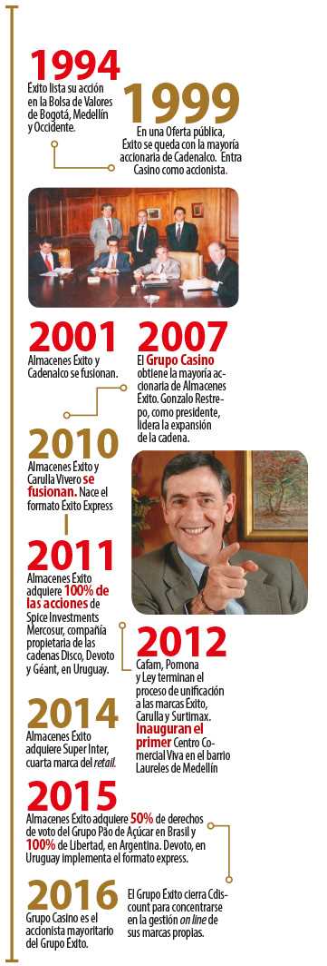 En 2015 adquirió 54% de los negocios de su controlante en Suramérica –Grupo Casino–, representados en 18,8% de participación accionaria, el control del Grupo Pão de Açúcar (GPA) en Brasil y 100% de Libertad S.A. en Argentina. Esta operación ascendió a US$1.826 millones y, según Giraldo, le permitirá al Éxito capturar sinergias que aumentarán su margen Ebitda en 50 puntos básicos progresivamente hacia el cuarto año de implementación, con el apoyo de 200.000 colaboradores.