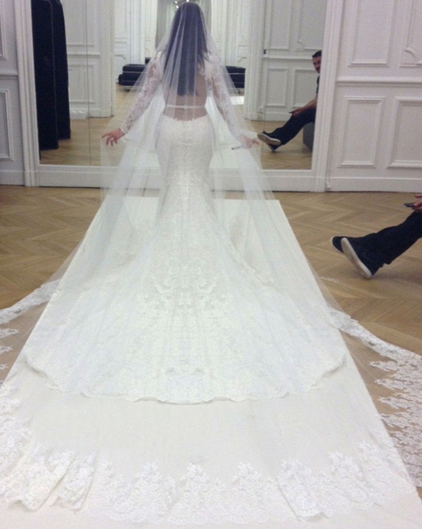 En la primera foto, la pareja luce feliz mientras se besa frente a sus familiares y amigos más cercanos y se revela el vestido de Givenchy Haute Couture lucido por Kardashian: