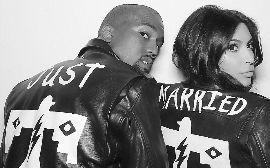 Kanye West (izq.) y Kim Kardashian (der.) con chaquetas que dicen "recién casados". Foto: E!