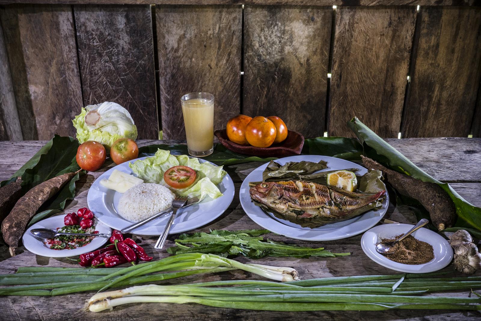 Ingredientes: Hoja de cirindango, cimarrón, cebolla larga, comino, ajo, yuca, arroz, lechuga y tomate, jugo de cocona (lulo amazónico) pescado de rio.