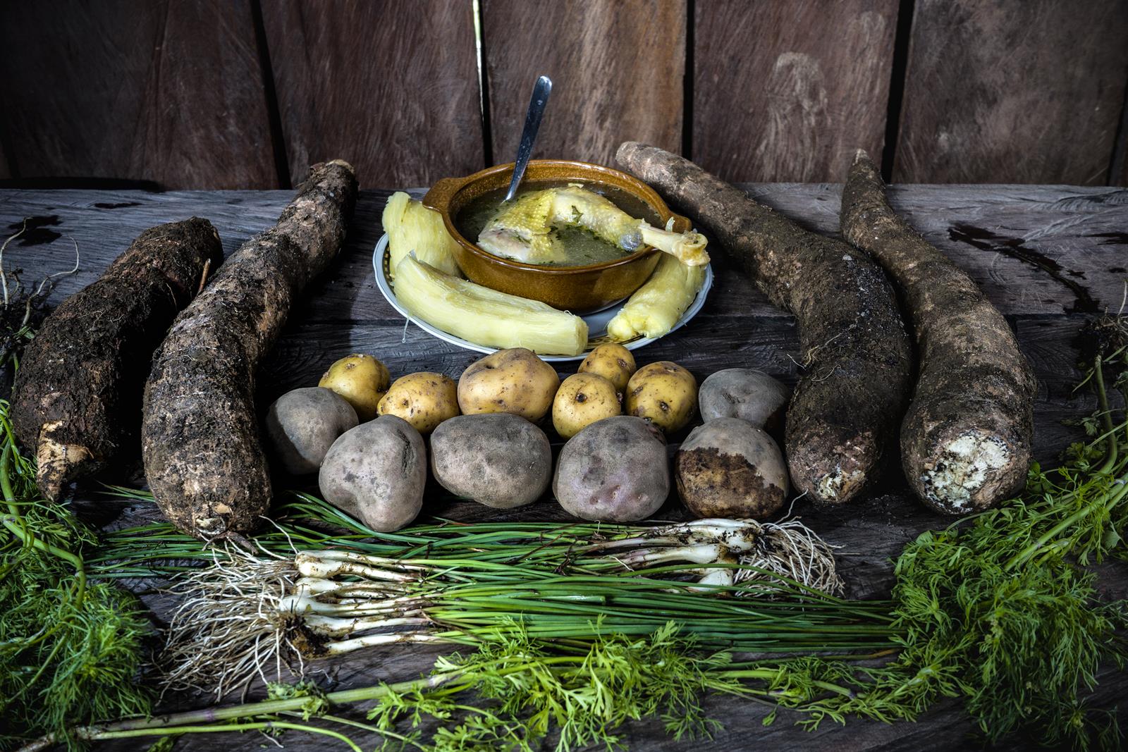 Ingredientes: Cebolla larga, cebolla peruana, yuca, papa parda, papa amarilla, cilantro y pollo de campo.