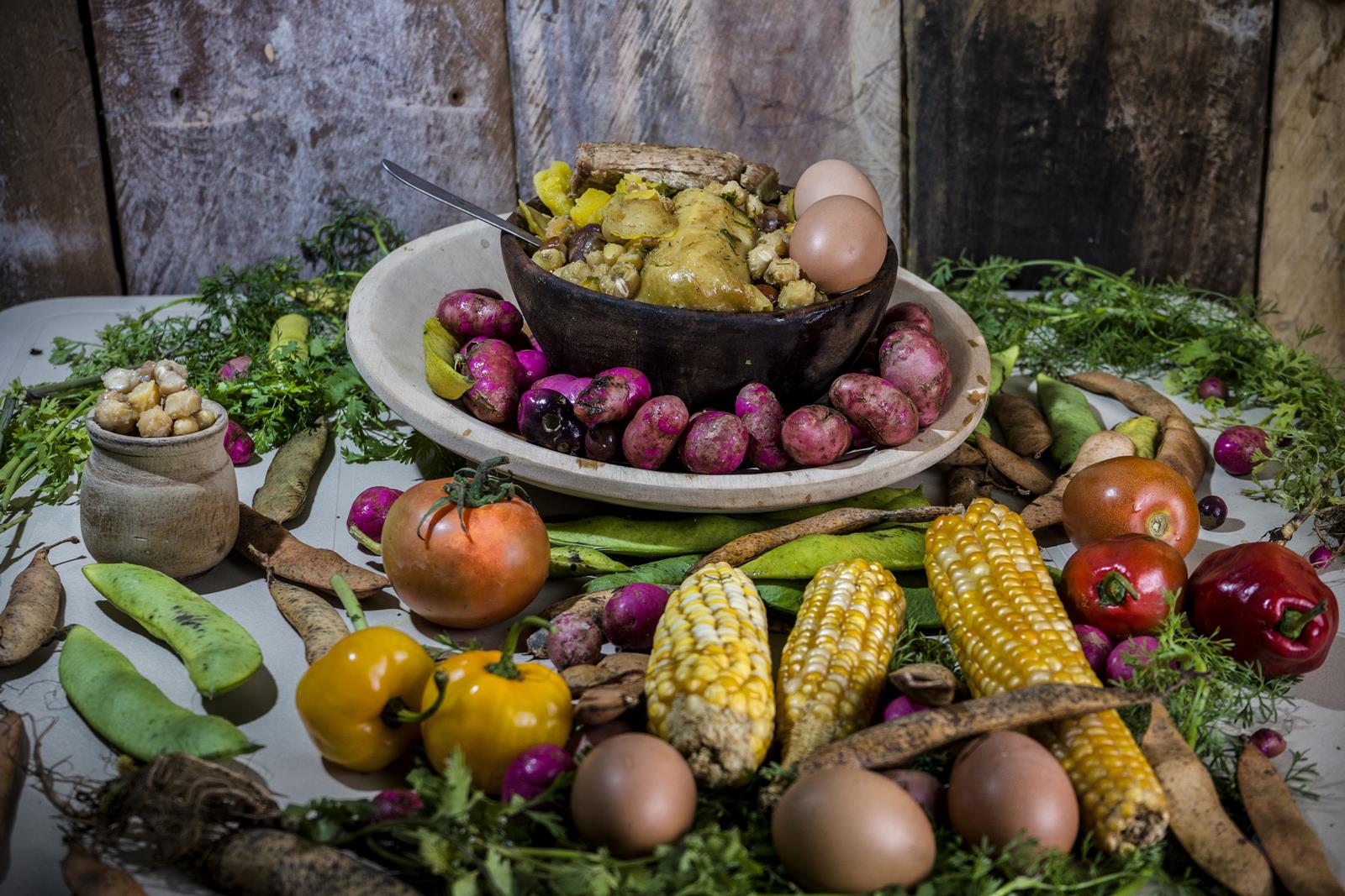 Ingredientes: Maíz, frijol, olluco, cebolla, cilantro, frijol, ají, tomate, huevo, carne de res, gallina de campo.
