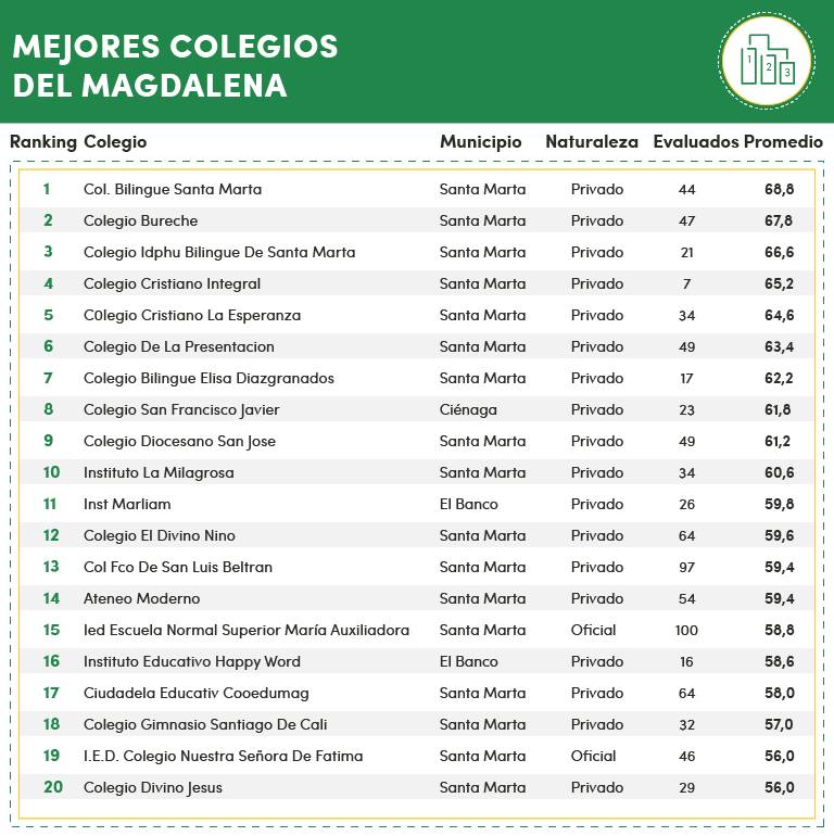 En el Magdalena el primer lugar se lo llevó el Colegio Bilingüe Santa Marta, cuyo promedio en las pruebas de estado fue de 68,8 sobre 100. Solo 2 colegios oficiales entraron en el top 20.