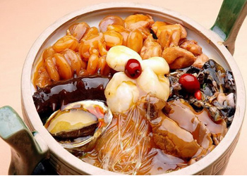 3. Buddha Jumps Over the Wall soup. Sopa elaborada a base de aleta de tiburón, abulón, flor de hongo japonés, pepino de mar, vieiras secas, pollo, jamón Hunan, carne de cerdo y ginseng.