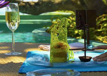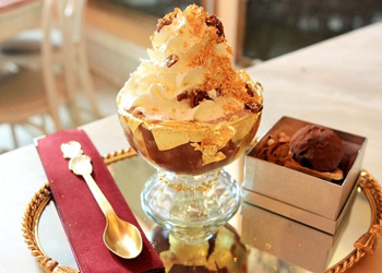 Se sirve en una copa llena de hojas de oro de 18 quilates y un brazalete de diamantes. Se come con una cucharada de oro macizo con incrustaciones de diamantes negros, blancos y color chocolate.