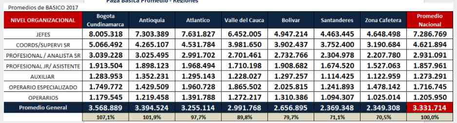 Como ya lo mencionamos, la región en la que mejor remuneran las empresas es Bogotá y la que tiene salarios más bajos es la zona cafetera. Este fenómeno se ve en todos los cargos, desde los líderes, hasta los profesionales u operarios. Un ejemplo de ello, es que en Bogotá un jefe puede estar ganando $8.005.318 mientras que en la Zona cafetera alguien con el mismo cargo puede estar recibiendo un poco más de la mitad $ 4.648.498, lo mismo ocurre con los operarios, que llegan a recibir en la capital cerca de $ 1.179.545 y quienes residen en la Zona Cafetera aproximadamente $ 1.025.014.