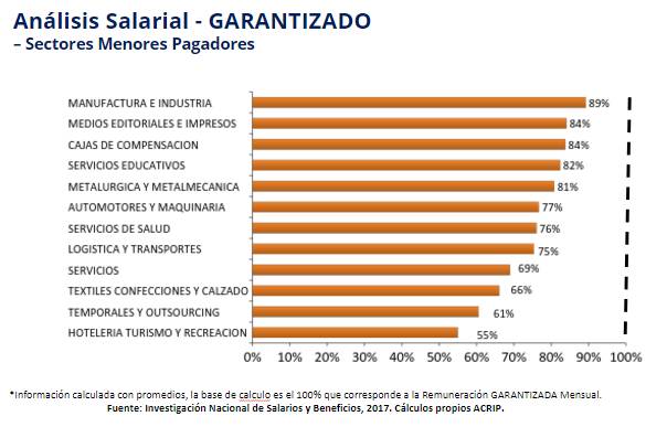 O por lo menos así lo reportó la Federación Colombiana de Gestión Humana (ACRIP), en la edición 42 de su Investigación Nacional de Salarios y Beneficios 2017. Un estudio en el que se encuestaron a los directores del área de Talentos Humanos de las empresas, participaron 24 sectores económicos de 14 ciudades (Armenia, Barranquilla, Bogotá, Bucaramanga, Cali, Cartagena, Cúcuta, Ibagué, Manizales, Medellín, neiva, Pereira, Santa Marta y Tunja) en un período de enero a agosto de 2017. Además se analizaron más de 900 cargos de 1.055 empresas y más de 1.000 registros salariales.