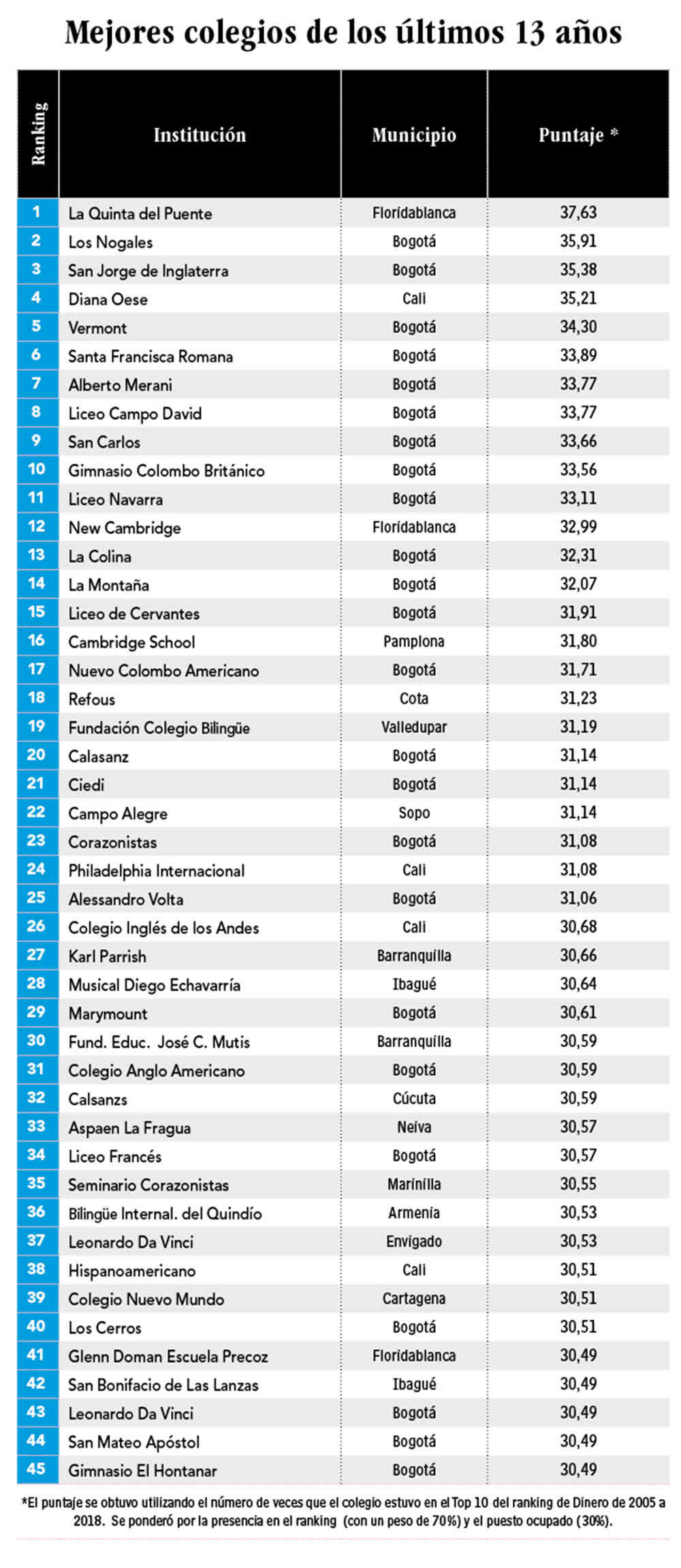 El segundo colegio más destacado en este ranking histórico es el bogotano Los Nogales, 10 veces en el Top 10. Su rector, Camilo Camargo, dice que ese logro es consecuencia de tres factores: una visión clara de las metas que quieren cumplir en lo académico y en valores, un equipo de profesores comprometido y un currículo actualizado para que los estudiantes adquieran las habilidades del siglo XXI. El tercer lugar es para el también bogotano San Jorge de Inglaterra, que ha estado nueve veces en el selecto grupo del Top 10, donde hay 15 instituciones de la Capital.