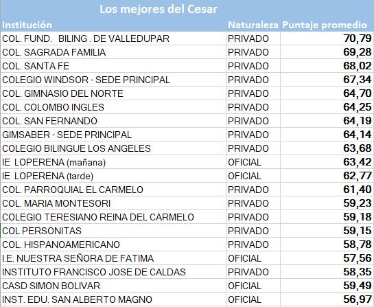 El Colegio Fundación Bilingüe de Valledupar fue el primero en la lista de los mejores colegios del Cesar, con un puntaje promedio de 70,79. Le siguieron el Colegio Sagrada Familia, Colegio Santa Fe, el Windsor-sede principal y el Colegio Gimnasio del Norte.