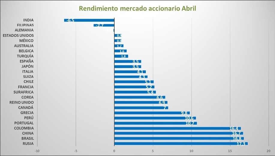 Por ejemplo, en abril una economía en crisis como la rusa generó una rentabilidad del 17,3% en la bolsa de valores, la de Brasil, otra economía en serios problemas, rentó el 16,8% y aunque las noticias en el frente económico fueron malas para Colombia, las de la bolsa de valores son muy positivas con un retorno del 16,4%. Todas estas rentabilidades expresadas en dólares para ser comparables. Lo que por demás sugiere, no sólo las acciones de estos países se valorizaron sino que sus monedas se fortalecieron frente al dólar.