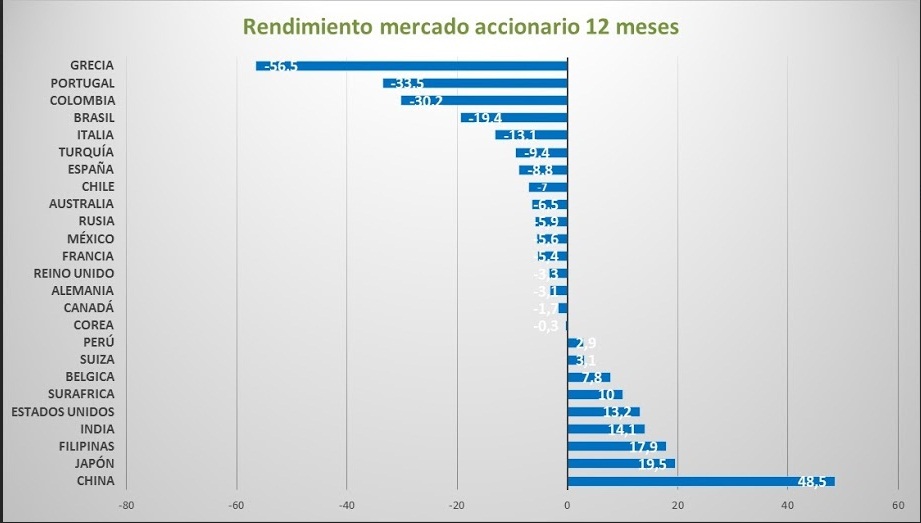 En el mismo mes la bolsa en Estados Unidos rentó 0,9%, la de Europa 4,5% y ela de Japón 3,5%. Por último, las acciones de la economía china, país que confirmó en el mes un bajo crecimiento, similar al de 2009, rentaron 16,7%.