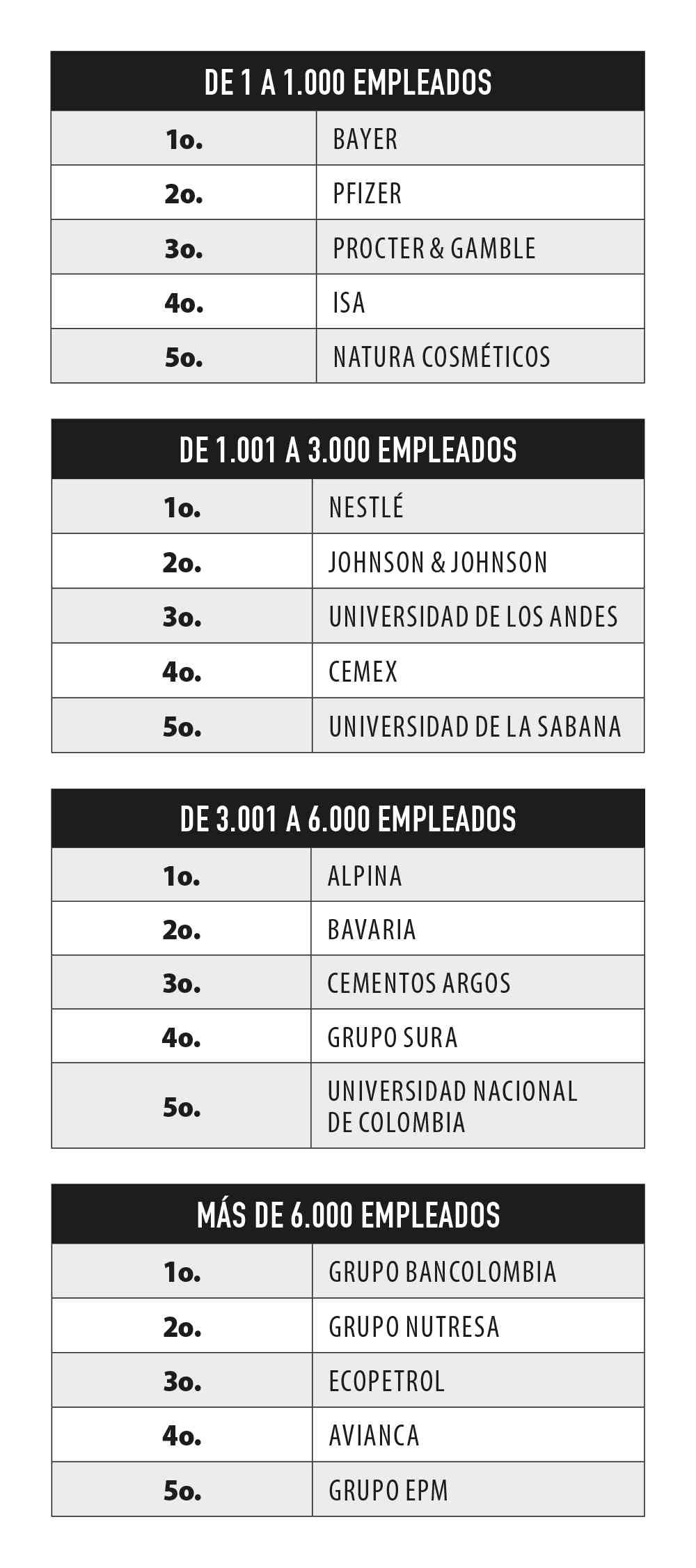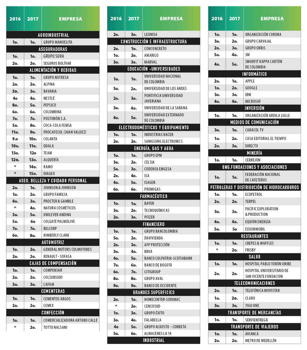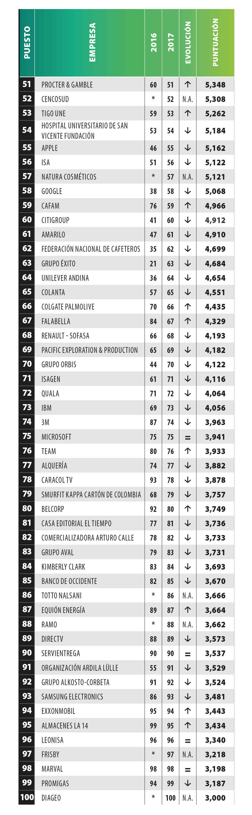 Por otra, hubo saltos significativos frente al año anterior. El de mayor tamaño lo dio el Grupo Carvajal que, de acuerdo con los resultados, subió 43 puestos, al pasar del lugar 67, en 2016, al 24 este año. También del Valle del Cauca, Tecnoquímicas fue la segunda empresa que tuvo mayores avances: del lugar 64 llegó al 28. Cerrejón subió 35 puestos y se ubicó en el lugar 27, y la Universidad de los Andes avanzó 33 escalones y llegó al puesto 16. Siguieron en ese proceso de crecimiento dos empresas del sector eléctrico: Celsia –del Grupo Argos–, que ascendió al puesto 26, tras haber estado en el lugar 58, y Codensa/Emgesa –que pasó del lugar 63 al 34–.