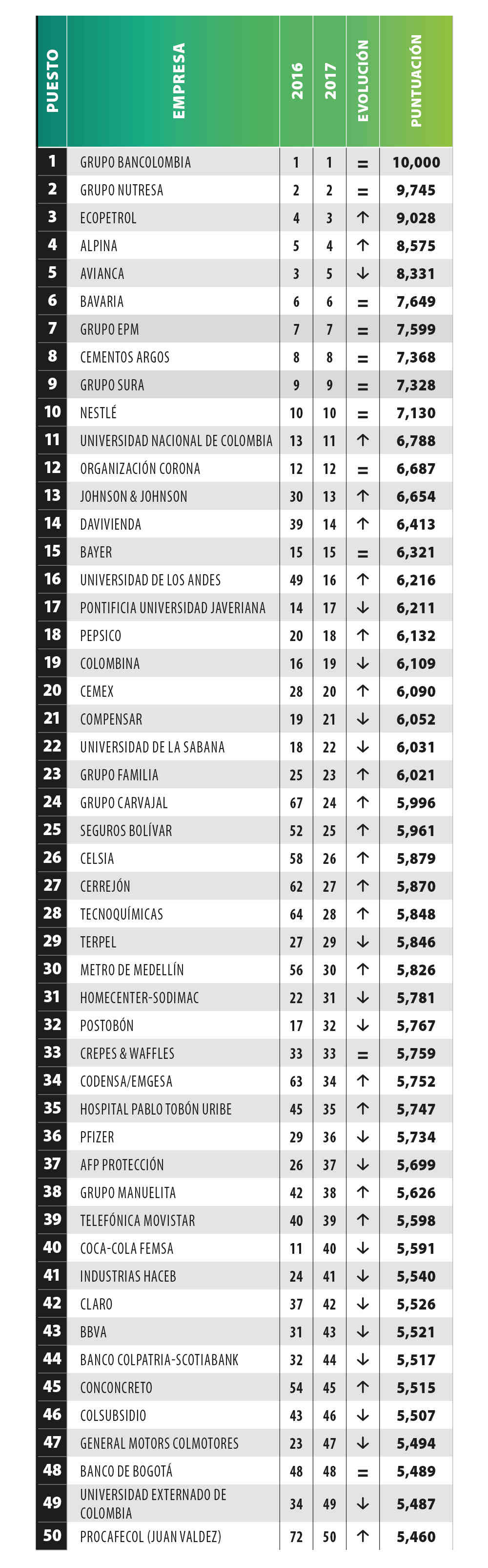 El primer gran resultado del estudio es que, con relación al año anterior, los dos primeros lugares se mantienen inamovibles: Grupo Bancolombia y Grupo Nutresa, que conservan los lugares de vanguardia. El otro resultado importante es que, si bien los nombres de las empresas que están en el top 10 no varían, sí hay cambios en las posiciones de tres de ellos: Ecopetrol, Alpina y Avianca. Esta última, según el estudio, pierde dos lugares y queda en el quinto puesto, mientras Ecopetrol y Alpina suben al tercero y cuarto, respectivamente. Los diez primeros puestos los completan en su orden: Bavaria, Grupo EPM, Cementos Argos, Sura y Nestlé.