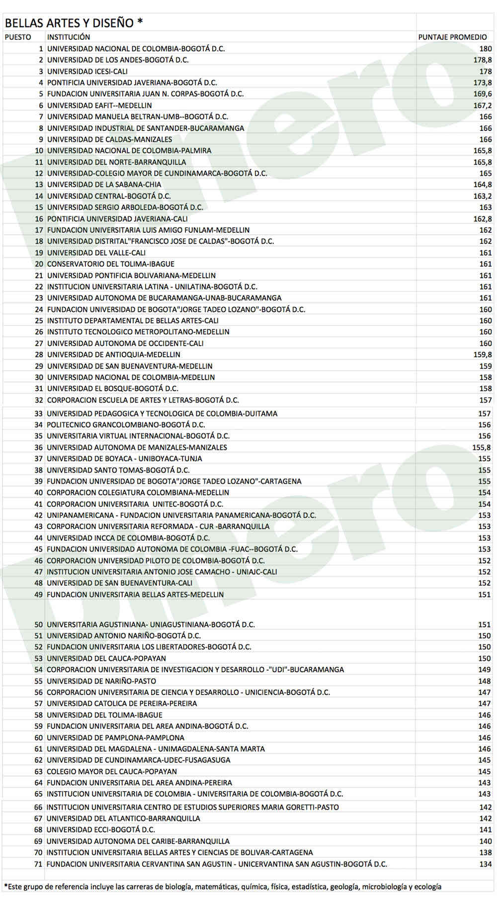 Dinero hizo una clasificación de las mejores universidades en bellas artes y diseño. Para efectos de este ranking no se incluyen las instituciones de formación técnica ni tecnológica, solo se comparan universidades e instituciones universitarias.