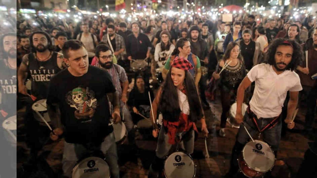 Al ritmo de tambores, doscientos jóvenes caminan por la carrera Séptima desde el norte de Bogotá. La jornada de vive en paz y sin intervención del Esmad. Previamente, estaban congregados en la plazoleta de Carulla en la calle 85 con carrera 15.