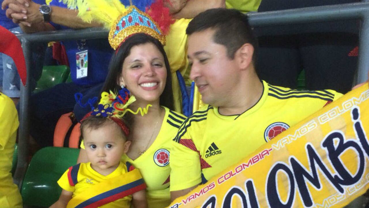 Padres jóvenes, Gustavo y Carolina vivieron la victoria de Colombia ante Polonia al lado de su niña de catorce meses, que sacó tiempo para dormir y ver celebrar a una tribuna que vestía como ella.