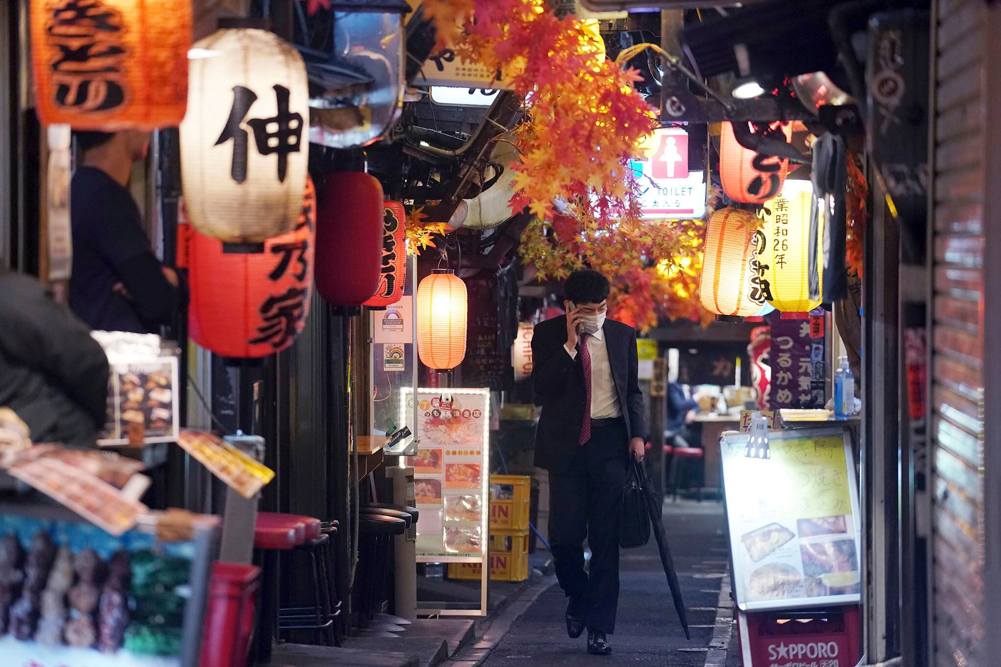Foto: APUn hombre que lleva un tapabocas para ayudar a frenar la propagación del coronavirus camina por una calle de un bar aliado el miércoles 25 de noviembre de 2020 en Tokio. La capital japonesa confirmó este miércoles más de 400 nuevos casos de coronavirus. Foto: AP / Eugene Hoshiko.