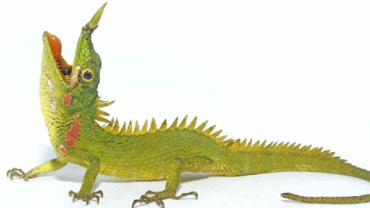 De acuerdo con el artículo científico, esta especie es un tipo de reptil que pertenece a la familia de los lagartos ‘agamidae‘, pues sus colores naturales son el amarillo y el verde, suelen vivir en los árboles y su comportamiento de camuflaje es muy similar al de los camaleones de las montañas africanas.