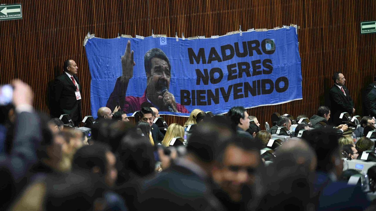 "Maduro no eres bienvenido", decía una enorme manta con la imagen del venezolano que colocaron legisladores del PAN, duro crítico del venezolano.