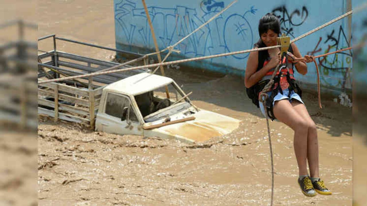 Cadenas humanas para poder cruzar las calles en los barrios populares de Lima, la capital de Perú, convertidas en ríos barrosos por los desbordes causados por las fuertes lluvias que caen en la cordillera de los Andes: una imagen nunca vista en la capital peruana.